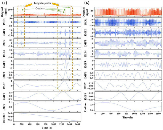 Figure 4 shows the results of CEEMDAN including the original signals, the IMFs and the residues of the initial time series (Figure 4a), and the time series processed by the Isolation Forest model (Figure 4b). From Figure 4, it can be seen that the nonstationary and nonlinear original signals have been decomposed by CEEMDAN into several sub-signals, which vary from high frequency to low frequency. The outliers of the initial time series (Figure 4a) have a negative effect on the decomposition process. There are obvious irregular peaks from IMF 1 to IMF 7 caused by the outliers. On the other hand, the IMFs of the time series after outlier correction are smoother and have less signal saltation.