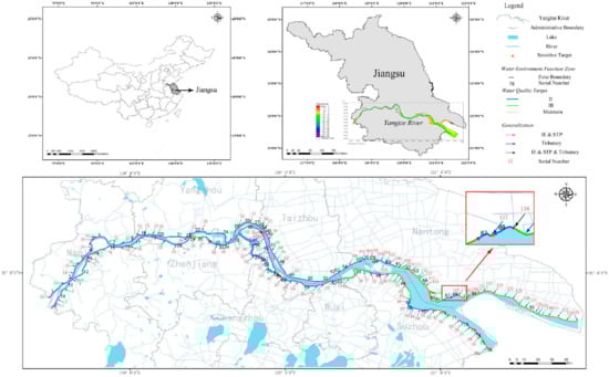 Jiangsu Province, a Chinese province currently undergoing rapid economic development, is faced with serious problems with regard to its water environment [,,]. In particular, drinking water sources, nature reserves, and control sections on the Yangtze River are at risk due to pollution. In the 21st century, water security issues have become of utmost importance [], and mathematical models have been used to assist in water quality management [].