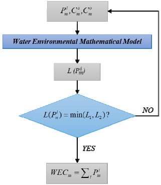Where is the pollution source of the ith generalized sewage outlet in the mth water functional zone (t/year), are the water quality target and current water quality, respectively, in the mth water functional zone (mg/L), is the maximum longitudinal length of the contamination zone in the sewage outlet (m), is 10% of the length of the water functional zone (m), is the distance between the sewage outlet and the nearest sensitive target, which is a drinking water source, nature reserve, or control section (m), and is the WEC in the mth water functional zone (t/year).
