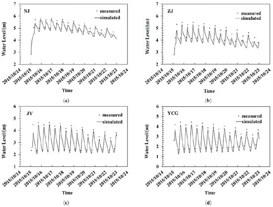 Calibration and validation for water level: (a) Nanjing (NJ); (b) Zhenjiang (ZJ); (c) Jiangyin (JY); (d) Yingchuangang (YCG).