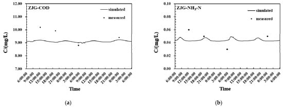 The PBIAS of the simulated water quality was calculated according to the measured water quality data of the drinking water source, e.g., ZJG and HG. The average PBIAS of ZJG and HG are shown in Table 3. Using ZJG as an example, the time series diagrams are shown in Figure 4.