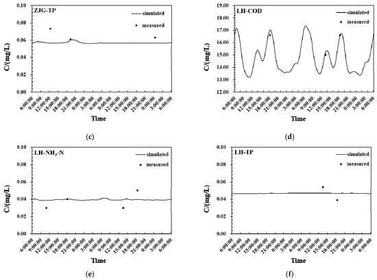 Calibration and validation for water quality: (a) Zhangjiagang (ZJG)-chemical oxygen demand (COD); (b) ZJG-ammonia nitrogen (NH3-N); (c) ZJG-total phosphorus (TP); (d) Liuhe (LH)-COD; (e) LH-NH3-N; (f) LH-TP.