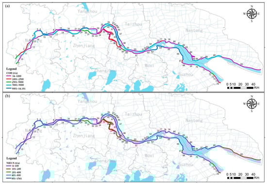 In 2017, 33,547 tons of COD, 1627 tons of NH3-N, and 178 tons of TP were discharged directly into the Yangtze River water environment functional zones in eight cities along the river by industrial enterprises and sewage treatment plants (Figure 1). Nanjing directly discharged the most pollution into the Yangtze River; the amounts of COD, NH3-N, and TP were 8924 t/year, 464 t/year, and 56 t/year, accounting for 26.6%, 28.5%, and 31.5% of the total, respectively (Table 1). Nantong discharged the second-highest amount of pollution, while Wuxi discharged no pollutants, directly.