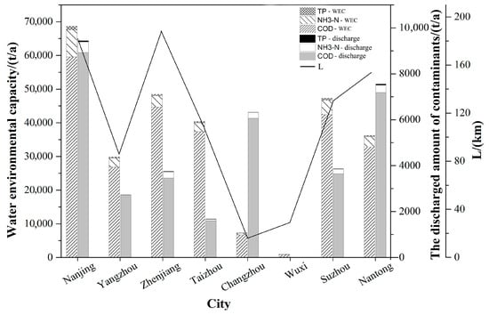 Based on the calculation of direct discharge pollutants earlier in the paper, Nanjing was found to be the city with the largest pollution discharge (Table 1). Nanjing was also the city with the largest WEC among the eight cities (Table 4), despite the fact that it had stricter water quality standards within the Yangtze River water environment functional area. According to the WEC calculation method, WEC was related to the water quality target, the maximum longitudinal length of the functional zone (L), sensitive targets, and the current sewage discharge. In order to prove that the calculation of WEC was reasonable, the length of the water functional areas was superimposed with the WEC and the discharged contaminants of each city. The results showed that cities with longer water functional zones generally had a larger WEC (Figure 6).
