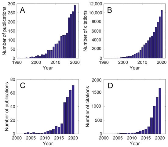 A summary showing an increasing interest in the concept of landscape system connectivity during the last decades (Web of Science Core Collection search was conducted on the title, abstract and keywords, within the timespan of 1900–2020). (A) number of publications focusing on connectivity: this search considers landscape connectivity, a term often used in ecology (search terms “landscape connectivity” OR “sediment connectivity” OR “geomorphic connectivity”); (B) number of citations (same search terms as in A); (C) number of publications specifically focusing on geomorphology/geosciences (search terms “sediment connectivity” OR “geomorphic connectivity”); (D) number of citations (same search terms as in (C)).