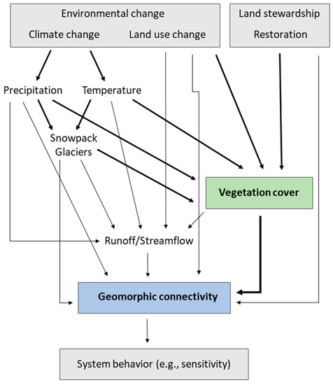 A simplified conceptual model illustrating the role of vegetation in mediating various effects of environmental change and land stewardship efforts (e.g., restoration) on geomorphic connectivity and, ultimately, the overall behavior of the fluvial landscape system. The pathways mediated by vegetation are represented by bold arrows.