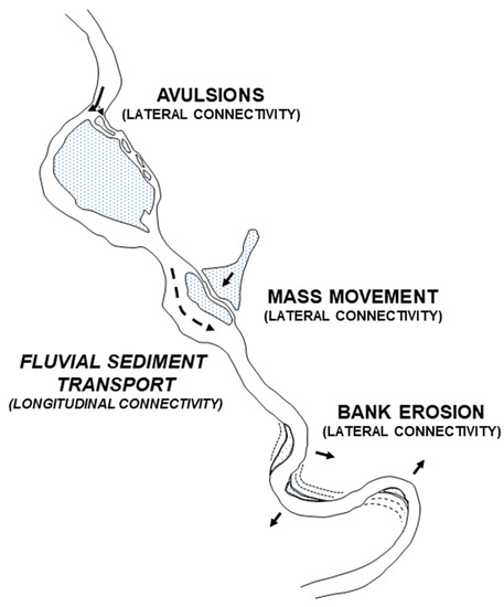 Rivers are complex and dynamic systems, constantly adjusting to a suite of changing governing conditions, which include the characteristics of the biophysical landscape within which they are embedded. From a geomorphic point of view, these adjustments are achieved through changes in sediment transport rates, which are, in turn, manifested in evolving channel morphology [1,2]. Because of the role of clastic material flux as the currency of river and landscape change, sediment yield and sedimentary archives have long been used as indicators of geomorphic behavior, for example, responses to disturbances and environmental change [3,4,5]. A long-standing recognition of the role that sediment routing plays in modifying such environmental signals [6,7] is reflected in a recent surge of interest in the concept of geomorphic connectivity (or sediment connectivity) (Figure 1). A range of definitions have been proposed but, essentially, the concept of connectivity is concerned with connections, or interdependencies, between parts of the landscape that are facilitated by sediment transfer (interested readers are referred to several excellent reviews on this subject: [8,9,10,11,12,13,14]). In this review, I refer to geomorphic (sediment) connectivity in the sense that is perhaps closest to the definition articulated by Heckmann et al. [12]: “we define (…) sediment connectivity as the degree to which a system facilitates the transfer of (…) sediment through itself, through coupling relationships between its components. In this view, connectivity becomes an emergent property of the system state, reflecting the continuity and strength of (…) sediment pathways at a given point in time. Structural connectivity represents the spatial configuration of system components; functional connectivity is inferred from the actual transfer of (…) sediment.” This definition can, conveniently, be applied at any spatial scale, including an assemblage of adjacent landforms or the entire drainage basin (e.g., in the context of sediment yield). Even though the concept can be adopted for geomorphic, hydrological, as well as ecological fluxes [11,15] the focus in this case will be primarily on sediment.
