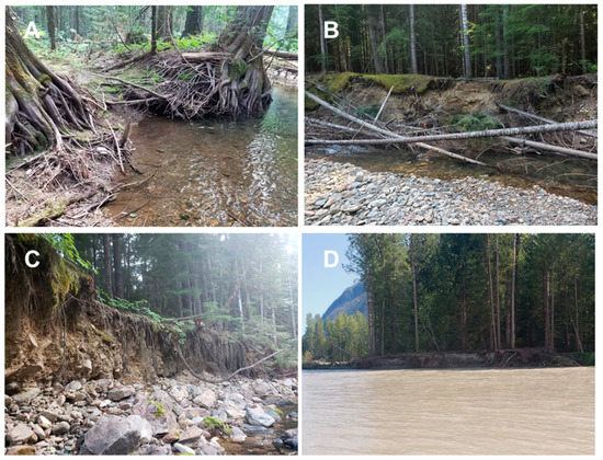 From the mechanical processes standpoint, vegetation adds weight, acting to destabilize the bank [76,86], whereas root system reinforces the bank, increasing its stability [87,88,89]. In addition, roots also promote bank resistance to hydraulic action [84] (Figure 4A). However, the effect of surcharge (added weight) tends to be relatively small. The magnitude of the reinforcement effect depends on the tensile strength of the roots and their distribution [81,90,91]. Importantly, it appears that the mechanical protection is unlikely to be effective in cases in which bank height is much larger than the rooting depth [92,93] (Figure 4B–D). This observation appears to suggest that the stabilizing influence of vegetation should be less prominent (or perhaps even negligible) in large rivers. Yet, empirical evidence reveals that the migration (hence bank retreat) rates are as much as ten-fold lower in vegetated meanders compared to unvegetated ones, even in relatively large channels [94]. Clearly, more research is needed to verify the role of vegetation in such reduced migration rates and to understand in detail the underlying mechanisms. In addition to the above processes, it has also been noted that presence or absence of riparian vegetation can influence subaerial processes that condition banks for erosion [70]. Finally, vegetation can exert control on bank erosion by influencing near-bank hydraulics. For example, research indicates that vegetation succession on point bar can enhance flow steering towards the opposite bank [95]. Similarly, flow characteristics relevant for bank erosion may be influenced by large wood (Figure 4B). Such downed wood, which commonly accumulates at the bank toe, can be derived locally, from trees toppled by the wind and recruited through bank undercutting, or advected from upstream. Recent research suggests that, depending on the density of these logs and their spatial arrangement with respect to the bank and flow structure, such features can both increase and decrease local bank erosion rates [96,97].