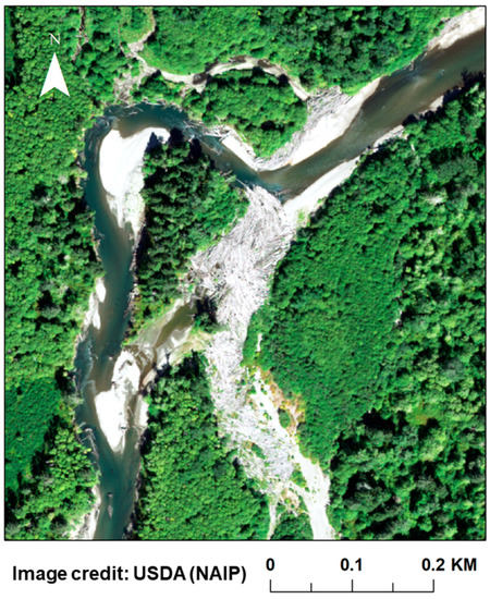 Large wood promotes avulsions and the development of multi-thread channel morphology. Note the logjams regulating inflow into the secondary and abandoned channels. Sediment storage facilitated by large wood appears to contribute to channel infilling. Flow from top to bottom. Image source: USDA The National Agriculture Imagery Program (NAIP).