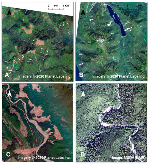 Forest cover disturbance and geomorphic response. (A,B): a large number of landslide scars (open slope failures and debris flows) in logged terrain. (C) stream-side slope failures generate a sediment pulse—note channel aggradation downstream of the sediment entry points. Flow from the bottom to the top. (D) long-term channel recovery from a sediment pulse—note extensive bars indicating abundant sediment storage well over two decades after a large, episodic supply. Flow from the bottom to the top. Image source in (A–C): Planet Team [196].