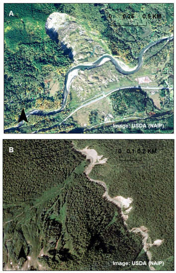 Process interaction in fluvial systems: lateral channel activity (channel-valley floor connectivity) leads to slope toe undercutting, triggering or contributing to slope failures (hillslope-channel connectivity). (A) Large, deep-seated landslide along Stillaguamish River, WA. (B) Smaller slides along White Chuck River, WA. Image credit: USDA (NAIP).