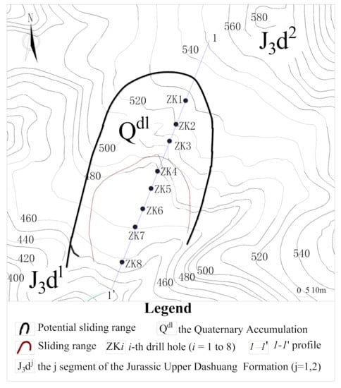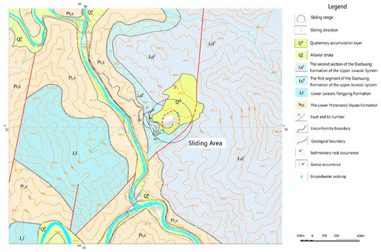 The geological map is shown in Figure 5. As a result of a combination of drilling, geophysical prospecting, in situ testing, and various types of experimental data, the lithology of the strata can be summarized as follows: the regional strata exposed mainly include the Lower Proterozoic Siyuan Formation (Pt1s) (distributed on the west side of the landslide area), the Jurassic Upper Dashuang Formation (J3d) (distributed on the west and northeast of landslide hazard area), and the Quaternary accumulation (Q) (distributed on the lower part of the slope).