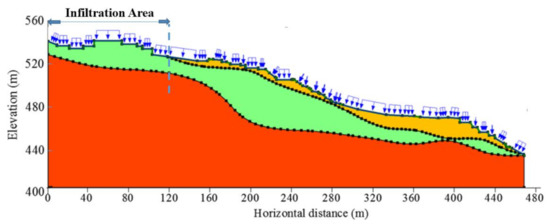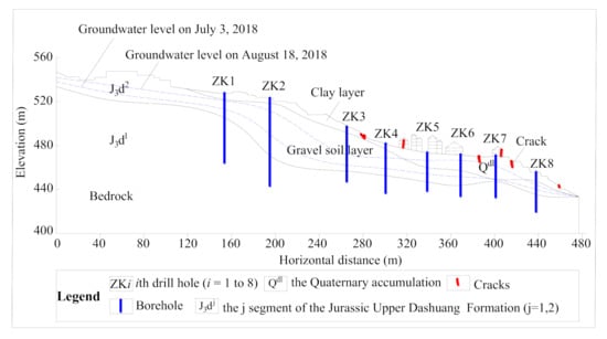 Pumping tests were carried out in different boreholes with different water table levels. The holes were drilled along the whole pipe. In addition, if there was more than one rock mass in a borehole, the filling method was used to separate the rock mass to obtain the permeability of a single rock mass. The test was carried out many times, and finally, the average value was taken according to the different measurement positions. The average permeability coefficient of the surface clay layer was 2.61 × 10−8 m/s, and the average permeability coefficient of the lower gravel soil layer was 2.85 × 10−6 m/s. The Fanshantou landslide has a binary hydrogeological structure, i.e., the clay layer with a lower permeability covers the gravel soil layer with a higher permeability. It should be noted that there is no clay layer with low permeability at the back of the landslide. Gravel soil layers with a high permeability are exposed on the surface (Figure 3). This stratum distribution provides good conditions for rainfall infiltration.