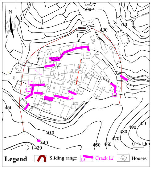 Figure 4 shows the planar view and crack distribution map of Fanshantou Village, which is the landslide area in Figure 2. On 27 July 2010, cracks appeared in the floors of 13 houses in Fanshantou village. The elevation is mainly 460–480 m above sea level. In the middle of the village, an almost fully connected arc-shaped crack, L1, formed from west to east. The cracks were mainly located near the toe of the landslide. As time passed, the cracks gradually increased and widened, forming a group of cracks, as shown in Figure 4.
