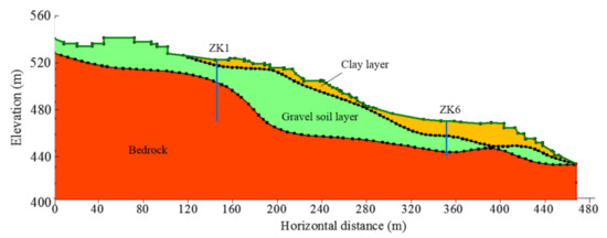 Boreholes reveal that the deposits in the landslide area can be divided into two engineering geological layers: the clay layer and the gravel soil layer. Their distributions are given in Figure 3. The main composition contents of the two types of strata are shown in Table 1. The clay layer is distributed on the surface of the landslide. The gravel soil layer is distributed throughout the landslide area and is located below the clay layer (Figure 3). The clay layer is exposed at the surface at the back of the landslide. This layer is thicker in the middle and rear part of the landslide but thinner in the front part of the landslide. The bedrock in the lower part of the landslide area is an impermeable layer.
