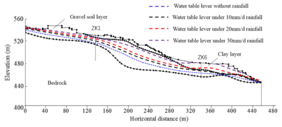 The final groundwater table levels and the initial groundwater table level are given in Figure 9 for 5 d of rainfall with different intensities (0, 10, 20, and 30 mm/d). The results of Figure 10 show the following: (a) Before rainfall, the groundwater table level in the slope remains below the bottom of the clay layer, i.e., before rainfall, there is no confined water in the slope, and the groundwater is phreatic water. (b) During rainfall, the groundwater table level rises gradually, but the rate of increase and the range of the groundwater table level are different under different rainfall intensity conditions. (c) Under the 10 mm/d rainfall intensity condition, the groundwater table level of the slope never reaches the bottom of the clay layer, and confined water never forms. Therefore, under the natural conditions of low and moderate rainfall, groundwater always occurs in the form of phreatic water, and no confined water forms. (d) Under the 20 mm/d rainfall intensity condition, the groundwater table levels are higher than those of a rainfall intensity of 10 mm/d; after 72 h of rainfall, the groundwater table level near ZK6 in the front of the slope rises above the bottom of the clay layer, which means that confined water forms locally; with the continuation of rainfall, the scope of the confined zone gradually expands. (e) Under the 30 mm/d rainfall intensity condition, the most obvious characteristics are that a larger area of confined water, a higher pressure head of confined water, and the seepage area of groundwater appear; a field investigation also found that after heavy rainfall, a large number of spring seepages appear in the corresponding area; after 24 h of rainfall, the groundwater table level at ZK6 in front of the slope rises above the bottom of the clay layer, which means local confined water is formed; after 72 h of rainfall, the groundwater table level reaches the surface. (f) With the increase in rainfall intensity, it is inevitable that confined water will develop and cause frontal seepage.