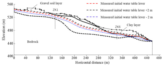 Three calculation conditions with different initial water table levels, which are equal to the measured initial water table level, the measured initial water table level +2 m, and the measured initial water table level −2.