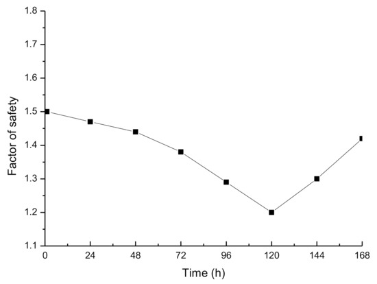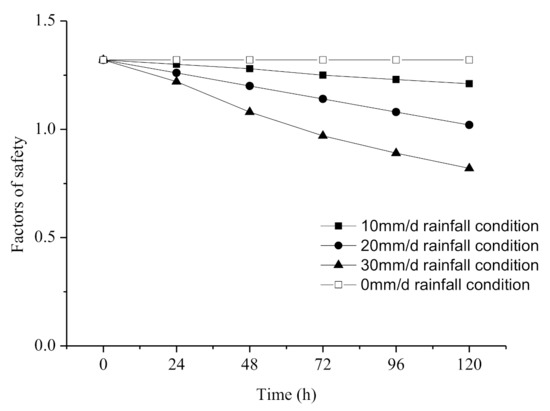 The factors of safety obtained under different rainfall conditions are plotted in Figure 14. Because the initial water table level conditions were the same, the initial factors of safety of the slope are the same. Figure 14 clearly shows that with the occurrence of rainfall, the slope’s factor of safety decreases to different degrees. When the rainfall intensity is 10 mm/d, the factor of safety decreases a little but is always larger than 1. When the rainfall intensity increases to 20 mm/d, the temporary confined water is formed gradually. The factor of safety gradually begins to drop below 1, and the slope becomes dangerous. When the rainfall intensity increases to 30 mm/d, the confined water begins to form more quickly and the factor of safety continues to drop below 1. Here, the slope is a safety issue. Therefore, rainfall intensity has a great influence on the stability of this type of slope.