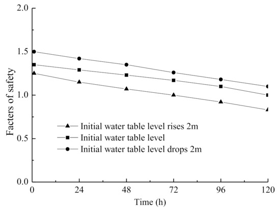 The factors of safety obtained under different initial groundwater table level conditions are plotted in Figure 15. It clearly shows that: (a) For different initial groundwater table levels, the factor of safety decreases with the increase in rainfall duration. (b) The higher the initial water table level, the lower the factor of safety, and the easier it is for the slope to lose stability. (c) The factor of safety can be kept in a relatively safe range when the groundwater remains in the form of diving water in the permeable layer. When the groundwater crosses the bottom of the upper clay layer and produces temporary confined water, the factor of safety drops further, and the stability is greatly reduced.
