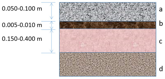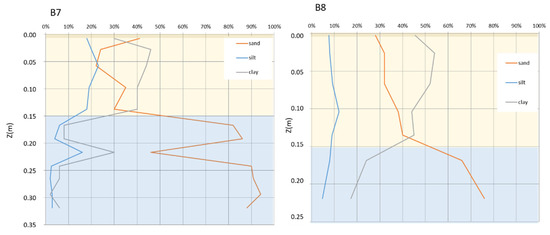 A vertical core was taken on each kind of soil and each sample was subdivided respecting the changes in material and in any case with a maximum thickness of 0.050 m. Each sample was dried in the laboratory and each subsample was analyzed separately. The gravel and coarse sand were separated by sieving at 0.002 m and 0.0005 m, the rest, the fine fraction, was analyzed by the Bouyoucos densimeter technique [38] to obtain the different textural classes (clay, silt, and sand). The variation of each fraction obtained as a function of depth is shown in Figure 4.