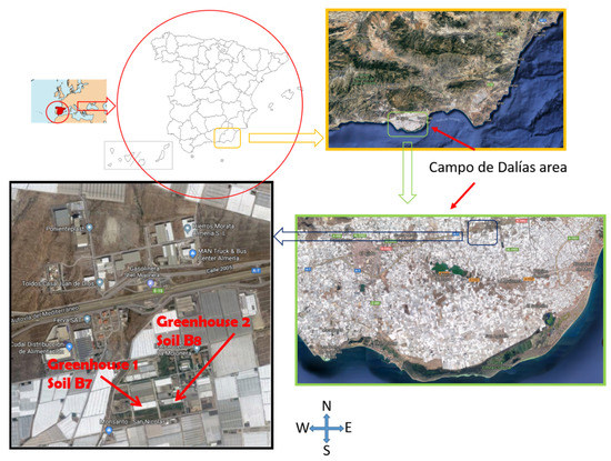 The trials were carried out at the IFAPA Center La Mojonera (Almeria, Spain). For the experimentation, two multi-tunnel type greenhouses of 900 m2 called B7 and B8 were used. The position of the center as well as the precise location of the tests are shown in Figure 2.