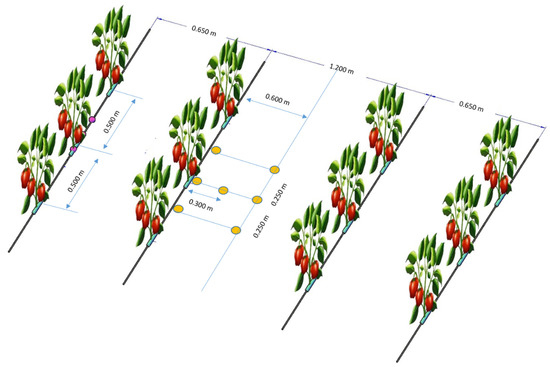 The watering system is automatic, with drippers of nominal flow Qn = 8.33 × 10−7 m3·s−1, self-compensating, and Netafim PJC Anti-drainage. The irrigation pipes are arranged in paired lanes, with a distance between them of 0.65 m and a distance between lanes of 1.20 m. Within the watering line, the emitters are spaced by 0.5 m apart. The arrangement of the watering frame is shown in Figure 3. Irrigation control is carried out by means of classic tensiometers with a built-in pressure transducer, which indicates to a computer that the set tension has been reached and this commands the irrigation automaton to carry it out by automatically opening and closing electrovalves. Following the usual recommendations for irrigation in the area, for sweet pepper, a tension of ψ = 1 m was set, the programmed irrigation time was of 1200 s. Under these conditions, humidity variations are expected to be minimal that will allow testing the sensitivity of the probes and the model.