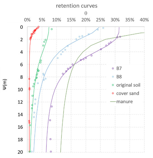 The soil sample B7 was subdivided into two subsamples corresponding to consecutive depth parts of the core taken from the profile. It can be observed that soils B7-a and B7-b are practically the same, which seems to confirm that the profile is homogeneous. The two soils, B7 and B8, also show a similar curve, in spite of their textural differences. The bases also show the same behavior which is in line with the fact that the two substrates are almost identical in terms of texture. The sand cover, due to its granulometry, presents an extreme retention curve, in the sense that its capacity to store water is very low and falls very quickly when the tension increases, even slightly. Some authors [50] have found similar behavior in mulching materials. These results are consistent with the estimates made based on the texture of each sample (see Figure 7).