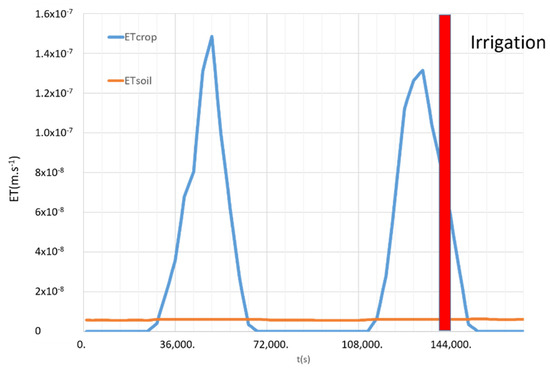 The simulations were implemented in simple 3D geometry, with lengths in mm, and the working block size was 0.250 × 0.600 × 1.000 m. The processes activated were water flow and root water extraction. For water extraction by the roots, the Feddes option was used with P0 = −0.100 m, P0pt = −0.250 m, P2H = −8.000 m, P2L = −15.000 m, P3 = −80.000 m, r2H = 5.787 × 10−8 m·s−1, and r2L = 1.1566 × 10−8 m·s−1. The time unit was minutes up to a total of 2880, with 144 variable boundary values, every 20 min each, coming from data taken by a nearby weather station inside a similar greenhouse. Figure 8 shows the evapotranspiration data used as boundary variable values.