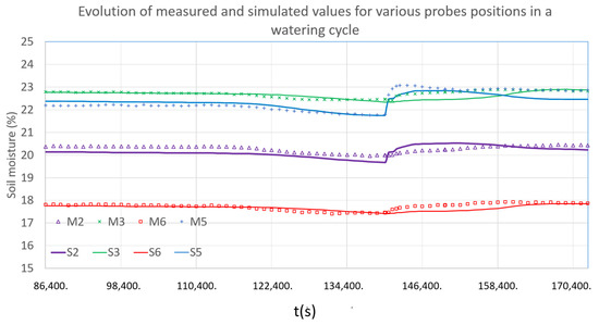 A series of observation points were defined in the model, coinciding with the positions of the probes installed in the field, in order to compare the field measurements with the values predicted by the Hydrus-3D model. Figure 10 shows the simulated (S) with Hydrus-3D and values measured (M) with the probes, shown in series of the same color, follow the same evolution. A similar behavior was observed in a vineyard [48] using a procedure like the one presented in this work.