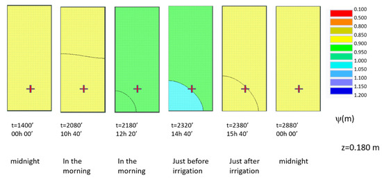 As an example, in Figure 9, critical moments of the day are selected. As commented, the simulation is started the day before so that the day to be simulated finds the pressure conditions correctly distributed in the 3 dimensions. The beginning of the day is presented at minute 1440 of the simulation, which corresponds to midnight. The effect of the water extraction by the crop on the previous day persists. The beginning of the day, and consequently, the beginning of the crop’s evapotranspiration occurs at minute 1800 of the simulation. It can be observed that the humidity has been redistributed and the profile presents an almost homogeneous humidity. In minute 2180, a remarkable extraction by the crop has already been reached, which reaches its greatest extension in minute 2320, when the irrigation takes place (the irrigation starts in minute 2340). From there, areas with a moisture deficit are filled from the water provided and from the redistribution from other points of the profile. At the end of the day a situation very similar to that of the beginning has been reached.