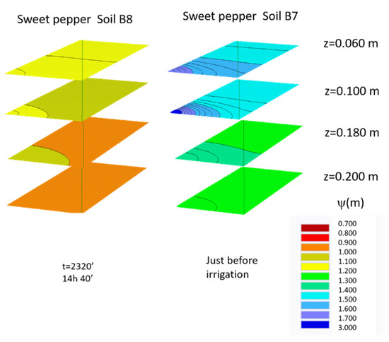 Soil water tension simulated by Hydrus-3D for different soil depths for t = 2320 min for sweet pepper in soils B7 and B8.