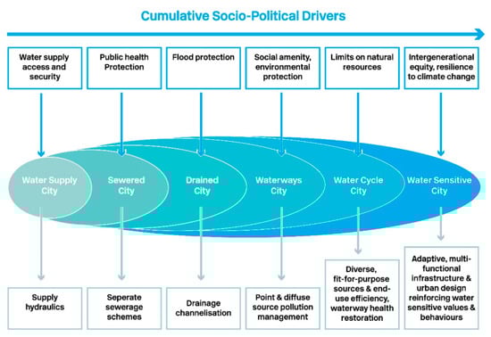 - Brown, R.; Keath, N.; Wong, T. Transitioning to Water Sensitive Cities: Historical, Current and Future Transition States. In Proceedings of the 11th International Conference on Urban Drainage, Edinburgh, Scotland, UK, 23–26 September 2008. [Google Scholar]