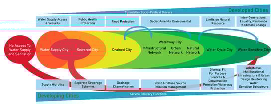 The first three stages describe the evolution of the water system to provide essential services: Access to potable water (Water Supply City), public health protection (Sewered City) and flood protection (Drained City). These three stages are followed by the Waterways City, Water Cycle City and ultimately a Water Sensitive City. The last three stages describe the evolution towards a higher order of services. These are: Social amenity and environmental protection, provide reliable water services under a constrained resources context, and ensure intergenerational equity and resilience to climate change []. In general, while the three first stages are critical for a city, the last three stages respond to broader needs of society since “people value ecological health, amenity, thermal comfort, beauty, and equity, characteristics that are influenced by water systems and considered to make a city livable” [].