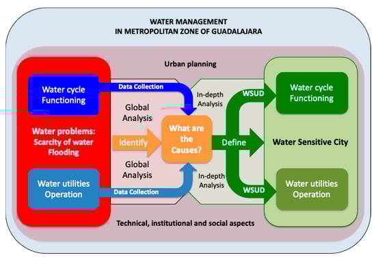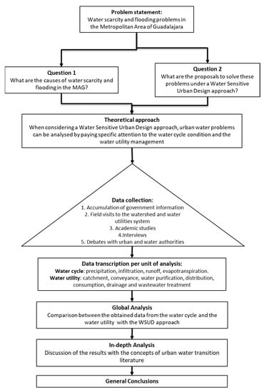 Considering the case study features aforementioned, this exploratory research uses a qualitative or interpretivist approach. The focus of this study relies on the analysis of the water management challenges in the MAG. The challenges of the MAG are not unique, on the contrary, they are similar to those that can be found in other metropolitan areas in Mexico such as Puebla, Monterrey, or Mexico City [,,]. Our study can help to set the main causes of the problematic and define the solutions based on WSUD approach and Water Sensitive City theory []. The analysis for this research is outlined in Figure 3.