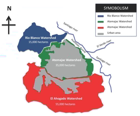 The MAG is the second largest urban area in Mexico and it is located in the western part of the country. Figure 4 shows the three watersheds that are included in the MAG: Río Blanco river, Atemajac Valley and El Ahogado. Guadalajara, the largest city in the metropolitan area, was founded in 1542 near the River San Juan Dios located in Atemajac Valley watershed. Guadalajara is the capital of Jalisco and together with the municipalities of Zapopan, San Pedro Tlaquepaque, Tonalá, Tlajomulco de Zúniga, El Salto, Ixtlahuacán de los Membrillos, and Juanacatlán create the MAG. The MAG has a population of approximately 5 million inhabitants, an annual population growth of 1.7% [] and occupies a surface of 2734 km2 [].