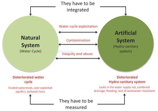 The Figure 6 below, shows the state of the water cycle and hydro-sanitary system. Both systems (natural and artificial) are related strongly by problems that affect each other. The water cycle has problems that should be addressed, and the hydro-sanitary system needs rehabilitation. These systems have to be integrated for getting a WSC through a WSUD approach.