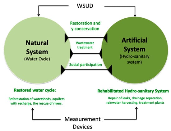 The first step to the integration of natural and artificial system is shown in Figure 7. The water cycle is restored through interventions in the watershed, that include recharging the aquifers and rescuing polluted rivers. The artificial system can be rehabilitated through the repair of leaks in water supply network, the separation of the drainage, implementation of rainwater harvesting systems and both the creation and operation of wastewater treatment plants. The restoration and rehabilitation could be possible by considering a WSUD approach.
