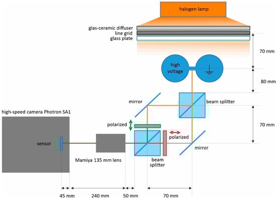 An MZI was constructed as diagrammatically shown in Figure 1. As light source a 100 W halogen lamp was placed behind a ceramic glass diffuser onto which a grid was placed (grid spacing 6.4 mm; line thickness 5.5 mm) which was held in place by the glass plate. The resultant image was projected onto a 50 × 50 × 50 mm3 beam splitter cube by the bridge which acted as a cylindrical lens. The two emergent images were linearly polarized (horizontally and vertically, respectively), and then recombined with another 50 × 50 × 50 mm³ beamsplitter cube and projected onto the sensor of a high-speed camera (Photron SA1, Photron, Tokyo, Japan) with a 135 mm Mamiya lens (Mamiya Digital Imaging Co., Ltd., Tokyo, Japan). With the help of the MZI the differently polarized light waves were then sheared against each other (see Figure 2) which made distinction between the two polarization directions possible. The vertical shear was aligned with a needle tip, with no horizontal shear allowed. In the resultant image the two polarization directions showed different intensities, since the vertical polarization was reflected three times, whereas the vertical polarization was reflected only once. Images were collected at 5000 frames per second full frame resolution (1024 × 1024 pixels).