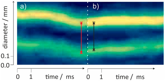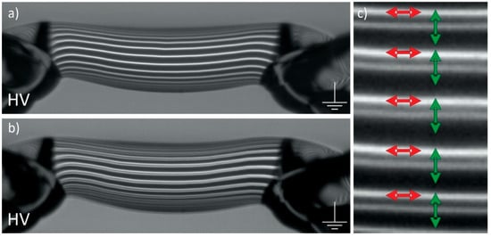 This figure shows that the spikes can occur at a higher frequency than the surface oscillations in unstable bridges with unstable vortices forming. Moreover, sometimes we observed that the differently polarized line patterns do not move in parallel which could indicate a local occurrence of birefringence. This is highlighted in Figure 8 where the line distance from a region within a spike (left) is compared to the line distance where there is no spike (right), taken from Figure 7. Compared to Figure 7, in this figure the contrast was enhanced in order to improve visibility. It should be noted that the displacement is very small and was only observed in unstable bridges with pronounced spike events. However, the onset of birefringence—the directional dependence of the relative permittivity, here due to effects involving the electronic polarizability [47]—was observed in previous experiments only very close to a needle charged with 20 kV. So another explanation for this variations in fringe displacement could be a very small horizontal misalignment which would show the greatest effect in steep gradients of the spikes.