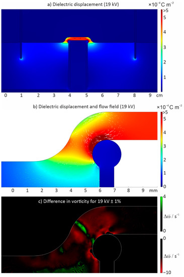 It has been shown experimentally [45] that EHD fluctuations at the transition points between bridge and bulk produce oscillations of about 100 Hz that travel through the bridge at flow speed. These shear layer oscillations between incoming charged flow and outgoing discharged flow are triggered by the minimal 50 Hz waviness still being present in the output of the high-voltage DC power supply. We have simulated this situation for a 19 kV bridge using the waviness given by the specifications of the manufacturer of the power supply, ±0.05% or, in this case, ±9.5 V, resulting in velocity variations up to 0.6 mm/s. This amount is too small to destabilize the bridge, but sufficient to trigger resonance effects in the shear layer. Moreover, since a change of diameter has a direct impact on the electrical current, the ripple causes a feed-back loop with the power supply amplifying the effect. In order to elucidate this situation we calculated the flow field for a 19 kV ±1% bridge as shown in Figure 3. In Figure 3b a vortex is clearly visible, as also found experimentally [45]. For the visualization of the flow field changes due to voltage variations we chose to depict the vorticity , a pseudo-vector field that describes the local spinning motion of a continuum or its tendency to rotate, and it is defined as