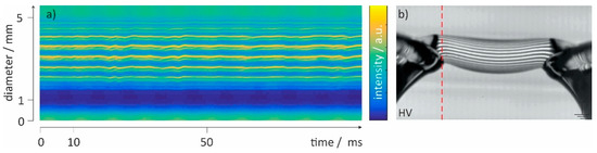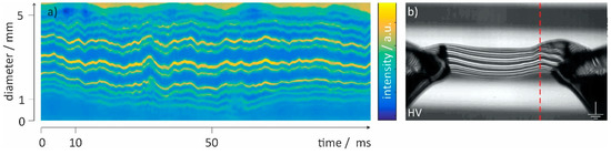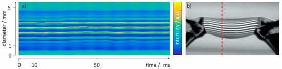 When the waviness of the power supply causes a back-and-forth movement of these local vorticity as shown in Figure 3c, small 100 Hz (squared amplitude of 50 Hz) pumping oscillations propagating through the bridge are the result. This effect has been reported before [45], and using the MZI visualization method described, this waviness was also observed in the present work as can be seen from the time–space plot created for radial sections defined by the column number in the frames as shown in Figure 4. Because a halogen lamp was used as light source, the 100 Hz intensity fluctuation caused by the lamp operated at 230 V/50 Hz can serve as reference for these pumping oscillations changing the bridge diameter (“ripples”) and thus the OPL and refraction R. These variations in R cause a periodical shift in the vertical position of the fringe pattern imaged (see Figure 4).