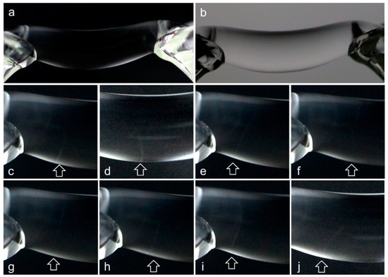 However, there are very fine vertical lines in the bridge in the above images that have no dark correspondence in the images without the crossed polarizers (Figure 5c–j). Their scattering signal was weak, which is why we could only see them using single photographs with a Canon 250D DLR camera, whose sensor is much more sensitive than the one of the SA-1 high speed camera. These lines are due to scatter centers moving from anode to cathode. They appear more often in bridges operated at higher potentials (~19 kV) and low conductivity (freshly deionized water ≥ 18 MΩ) in addition to the aforementioned waves. In long time exposures these structures add up and appear foggy, first attributed to nano-bubbles [18,19], which turned out not to be true [46].