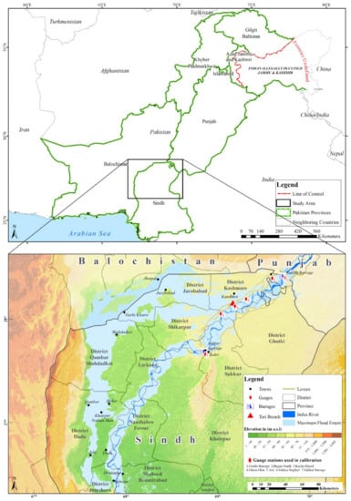 Floods are among the most common natural disasters around the world, claiming a substantial loss of life and property in the vicinity of rivers. Extreme rainfall is a major contributor to flooding along with minor contributions from snow–glacier melt, earthquakes, landslides, glacial lake outburst flooding (GLOF), and dam and levee failure/overtopping [1,2]. Pakistan is one of the most vulnerable countries in the world in terms of exposure to different natural calamities [3]. According to the Long-Term Global Climate Risk Index (CRI) 1991–2011, Pakistan ranked as the eight most disaster-prone country in the world; however, after the 2010 floods, Pakistan ranked at the top of the list of countries most affected by weather-related disasters [4]. In Pakistan, the Flood Forecasting Commission [5] classifies floods as low (river flowing within deep channel), medium (partly inundating river), high (river almost fully submerging and flowing up to high banks/levees), very high (river flowing between high banks/bunds with encroachment on the freeboard) and exceptionally very high flood (imminent danger of overtopping/breaching). For the Indus River, low flood discharge ranges from 7000 to 8500 cumecs, medium flood ranges from 8500 to 12,700 cumecs, high flood ranges from 12,700 to 18,400 cumecs, high flood ranges from 18,400 to 22,700 cumecs and exceptionally very high flood have discharge exceeding 22,700 cumecs [6]. Historically, overall Pakistan has faced about 38 floods (1947–2011) of various types and magnitudes causing severe damage to life and property [7,8]. This count has increased to 42 floods (1947–2015) with six years of consecutive flooding due to over topping of river discharge in most of cases, since 2010.