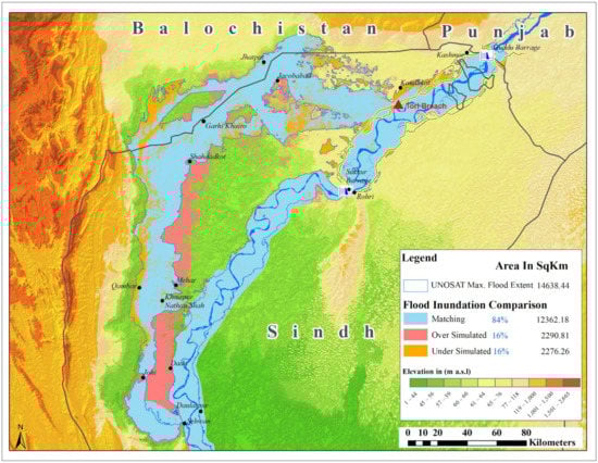 Additionally, the simulated flood propagation and flood extents on a daily basis were compared with cloud free MODIS Terra images (Table S1). The factual values in Table S1 shows that the HEC-RAS model performed fairly well in reproducing daily flood propagation in comparison to the MODIS extent with average, overestimation and underestimation matching values of 75, 37 and 25%, respectively (see Figure S5). Since the model was calibrated for 2010 flood (within the river reach and avulsion plain), therefore, by keeping all modeling parameters constant, the HEC-RAS model was validated for 2015 flood inundation over the avulsion plain, which occurred in the same Indus River reach. The result for the validation with 89% match and 77.22% measure of fit shows HEC-RAS model efficient (Figure S4). The over- (15%) and under-estimations (11%) were found to be slightly less for the validation in comparison to the calibration of the HEC-RAS model. The over- and under-estimations may be associated with the use of the coarse resolution DEM (i.e., DEM at 30 m resolution), uncertainties involved in modeling and MODIS based flood extent, as confirmed by [30]. Additionally, during the 2010 flood, the local flood control and management efforts, including engineered breaches (intentionally created), can cause of different simulated flood propagation in contrast to actual. The results obtained for the calibration and validation of HEC-RAS are in line with previous studies conducted in different regions of the world [1,17,40].