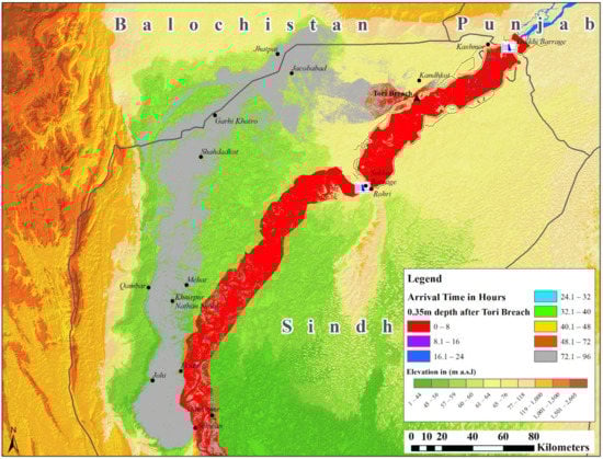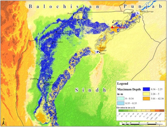 The calibrated HEC-RAS model was further used for flood inundation and risk hazard mapping of the study area by using flows simulated at Tori Levee as shown in Figure 5, Figure 6, Figure 7, Figure 8 and Figure 9. These maps included maximum flood-depth, -arrival, -duration, -velocity and -depth times velocities. The depth threshold, taken as 0.35 m, is beyond which the water depth can be life-threatening [48]. The floodplain depth (1.0 to 15 m) shown in Figure 5 shows the maximum depth >5 m within the main Indus River reach, Sukkur Barrage and Manchar lake. However, the depth over most of the alluvial areas varied between 0.36 and 2.25 m, with few places in different cities (i.e., Jacobabad, Shuhdadkot, Qambar, Johi and Dadu) ranged between 2.25 and 5.0 m which shows a greater life threat. Additionally, the maximum depth was noticed upstream of the barrages and near Tori Levee (Figure 5).