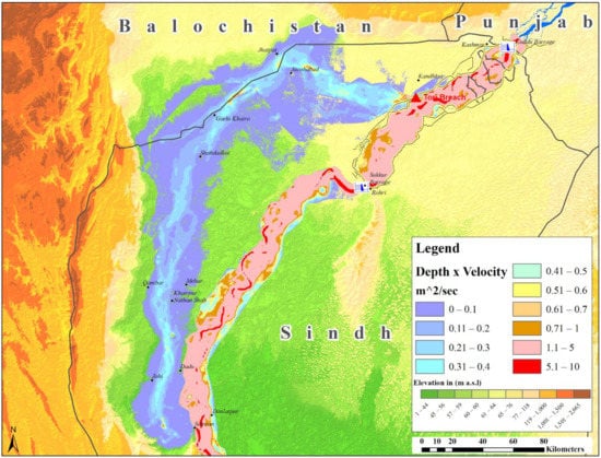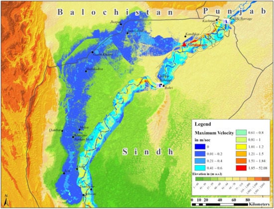 Furthermore, the flood velocity is another major hazard for human life and property, so extreme velocity maps were simulated using HEC-RAS to highlight the most fatality-prone areas due to high flood velocity. The floodwater velocity of 1.50 m/s can cause instability for an adult [49]. In relation to that, Figure 6 depicts the maximum velocity within the main Indus River course substantially above the threshold, resulting in a hazardous conditions, in comparison to the alluvial and floodplain where the range of velocities (0.01 to 0.80 m/s) was demonstrated by itself. Overall, low velocities were observed in the floodplain which may be associated with a low slope topography and an increase in elevation level on the western flood protection levees, as well as a high level of roads and irrigation canals compared to the natural surface level in the floodplain [33,36]. The slow propagation of the breaching water was dually confirmed by other studies [33] and reported the average velocity of 0.1 to 0.3 m/s over the avulsion plain down-valley, some propagation slowdown due to the high elevation of roads, irrigation canals and topographic gradient on the west side of the floodplain, as confirmed by [20,33]. However, in the southern part, the flood propagation was driven by the topographic gradient without the contribution of major breach flows from the Indus River. Conversely, the flood velocity within the main course of the Indus River channel travelled at three times this rate [33].