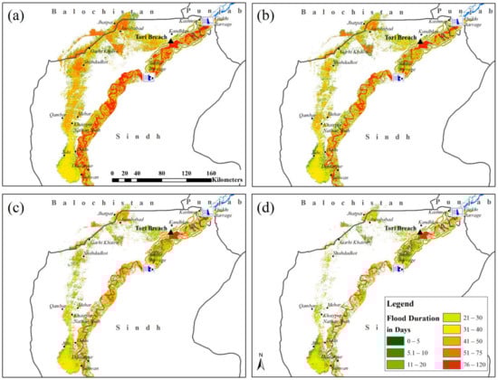 The flood duration maps for the 2010 flood were produced on the basis of four different threshold depths (i.e., 0.35, 1.0, 1.5 and 2.0 m) after the breach of Tori Levee (Figure 9a–d). Figure 9a shows that most of the floodplain was inundated for 31–50 days under 0.35 and 1.0 m water depth. Notably, several parts of the floodplain were also inundated under 1.50 and 2.0 m water depth for approximately up to 41 to 75 days, particularly the spots of Jhatpat, Jacobabad Qambar and Johi cities. Overall, it was noticed that the inundation of 2.0 m was retained for ≈50 days over a few spots of the floodplain after the time of Tori Levee breach, resulting in longer durations of internally displaced peoples (IDPs) in flooded regions. This avulsion flow propagated down valley at an average speed of (0.1 to 0.3 m/s); three times slower than the main channel flow. Periodically, the flow was delayed due to confrontation with elevated structures like irrigation canals, and levees and roads, until it rejoined the main Indus River on 21 September 2010 (after 37 days) [33], as also confirmed by comparing the simulation results and the MODIS daily flood extents.