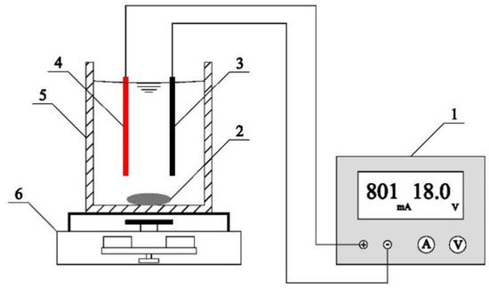 Schematic diagram of electrochemical cell lysis static experimental setup. 1. DC stabilized power supply; 2. Stir bar; 3. Titanium cathode; 4. Titanium coating electrode (anode); 5. Electrolytic cell; 6. Magnetic stirrer.
