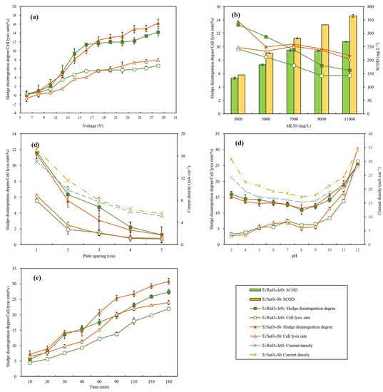 The effect of cell lysis using Ru-Ir and Sn-Sb electrodes varying: (a) Voltage, (b) MLSS, (c) Plate spacing, (d) pH, and (e) Time.