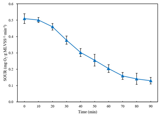 We can observe the lysis and destruction of sludge cells in the SEM images, and we can confirm the destruction of sludge cells according to the analysis of sludge biological activity. In this study, the specific oxygen uptake rate (SOUR) of sludge was used to characterize its biological activity. SOUR changes in the electrochemical cell lysis process are shown in Figure 5.